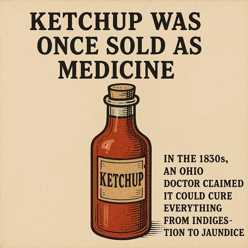 Ketchup was once sold as medicine. In the 1830s, an Ohio doctor claimed it could cure everything from indigestion to jaundice. That’s right — long before it became a burger essential, ketchup was bottled up and sold as a health tonic.