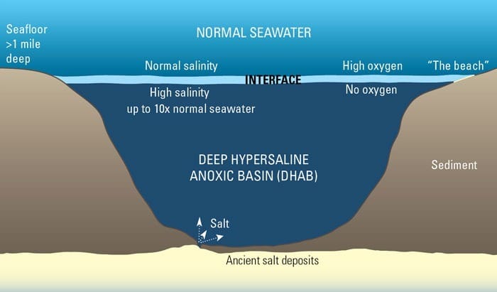 It’s super salty. Like, up to 10 times saltier than normal seawater. That makes the brine heavier so it sinks and settles on the ocean floor.